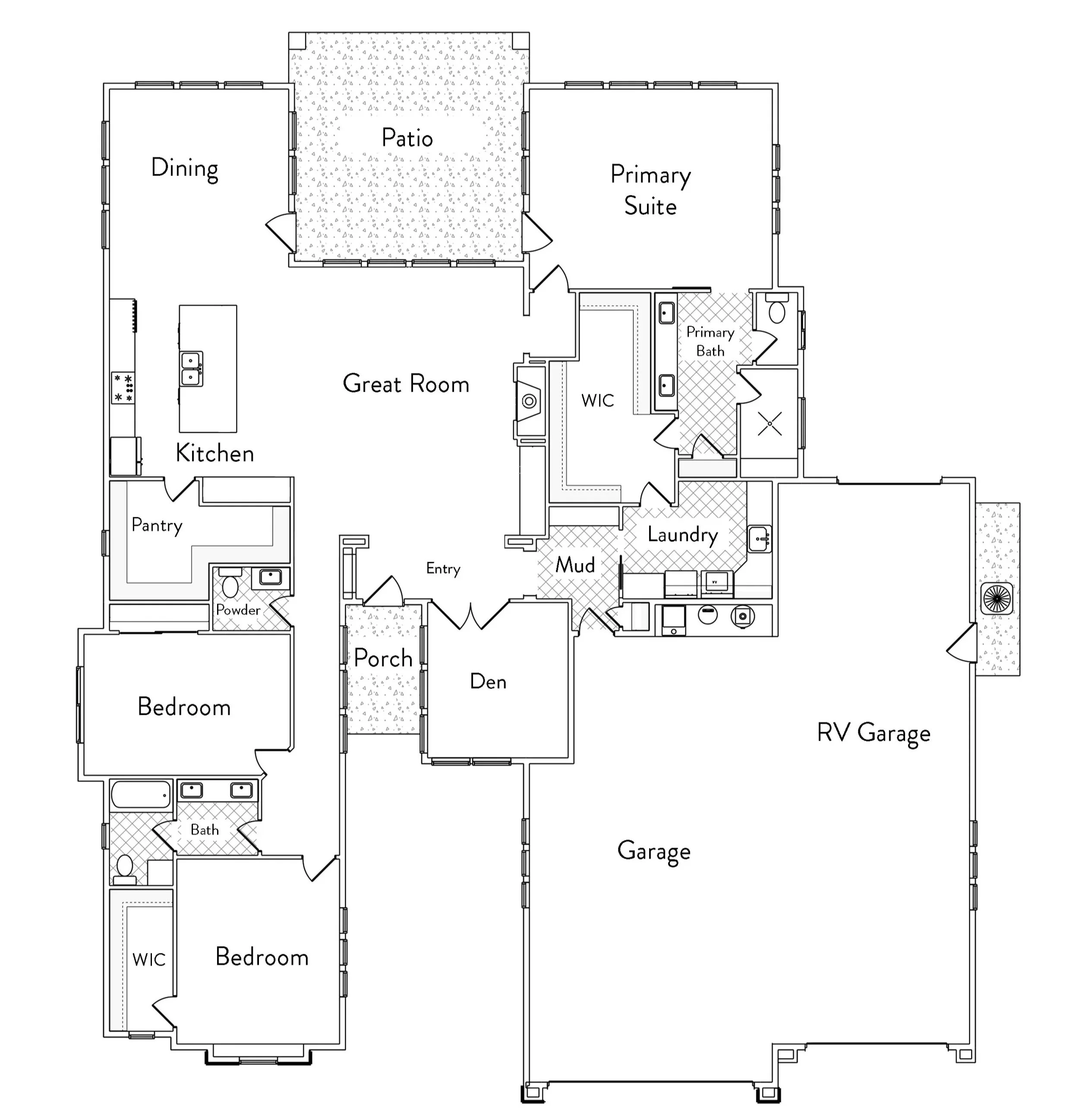 Floor plan of a house with rooms labeled including porch, two bedrooms, bathroom, den, kitchen, pantry, powder room, great room, primary suite with bathroom and walk-in closet, laundry, mudroom, patio, RV garage, and additional garage.